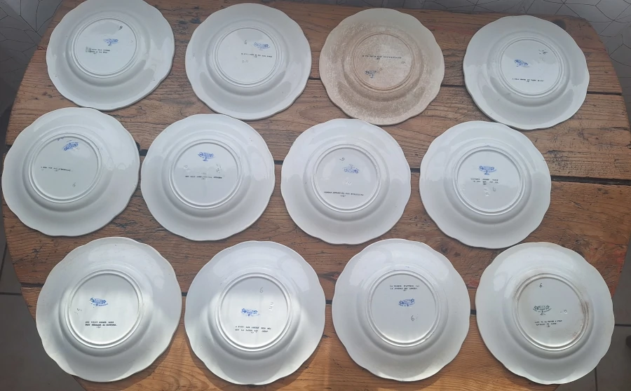 Une série complète racontée comme une petite épreuve de patience et de gourmandise. Deux assiettes portent les traces du temps — une plus marquée que l’autre — mais l’ensemble reste superbe.