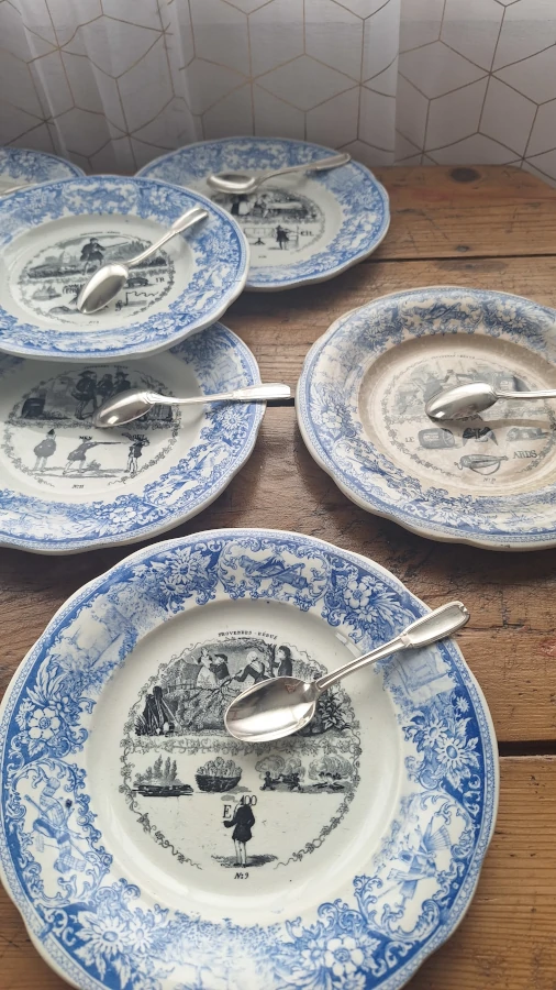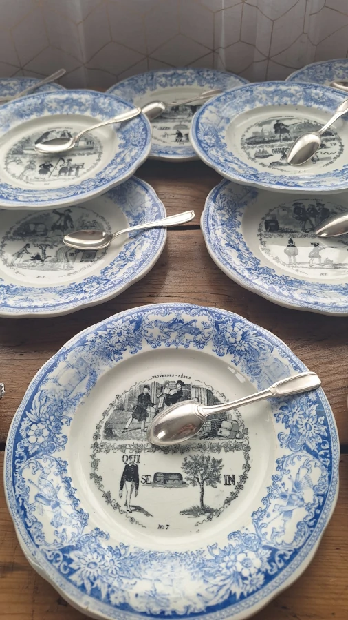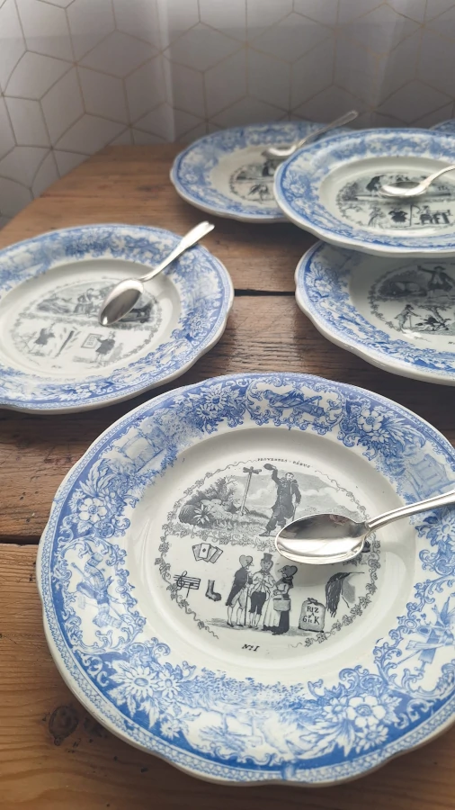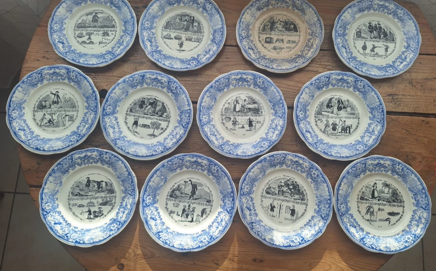 Ces assiettes à dessert parlantes rébus de Creil et Montereau, (Barluet & Cie, 1876–1884) forment un lot de 12 pièces. Chaque assiette raconte une petite énigme pour le dessert et reflète la finesse de la faïence du XIXᵉ siècle.
