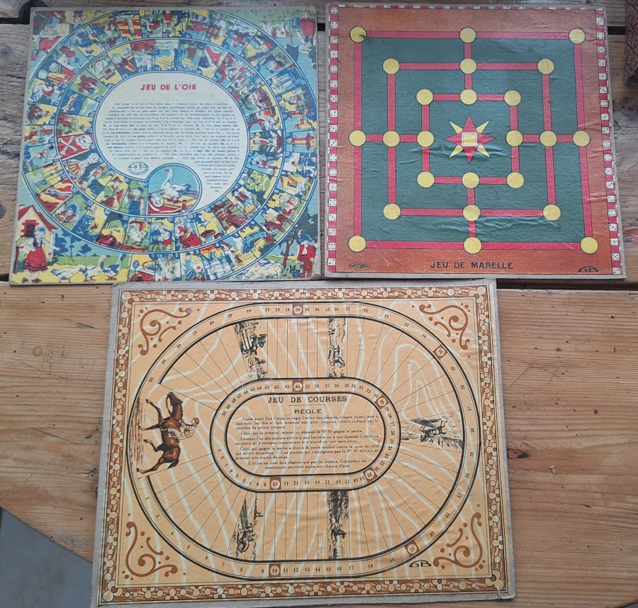 Boîte de jeux réunis : G.B. et Cie – N.K. Atlas, Paris (années 1920–1930).Elle comprend trois plateaux de jeux double face, réunissant : le Jeu de l’Oie, le Jeu de Dames, la Marelle, le Jeu d’Assaut, le jeu de course, ainsi que le jeu Ferme la Boîte (Shut the Box) et 11 petites boites.