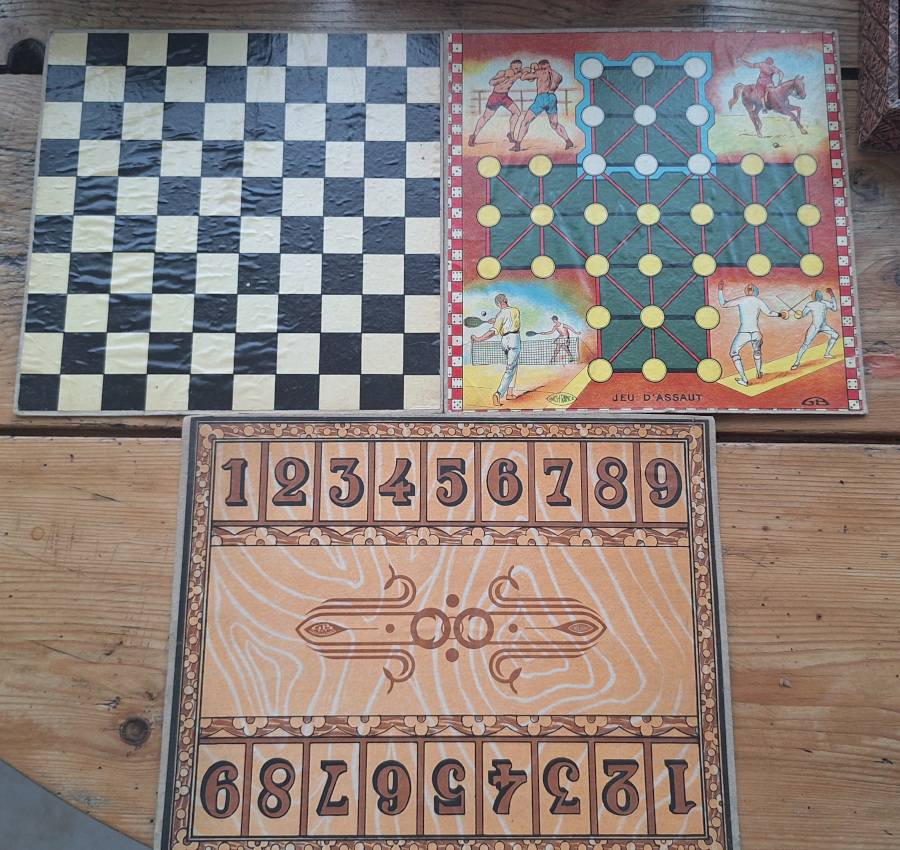 Elle comprend trois plateaux de jeux double face, réunissant : le Jeu de l’Oie, le Jeu de Dames, la Marelle, le Jeu d’Assaut, le  jeu de course, ainsi que le jeu Ferme la Boîte (Shut the Box).