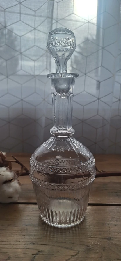 Élégante carafe à liqueur en verre moulé, ornée de frises et décors géométriques en relief. Probablement utilisée dans un intérieur bourgeois de la fin du XIXème siècle ou du tout début du XXème siècle, elle conservait son rôle de service raffiné pour les digestifs ou liqueurs maison. Son bouchon d’origine parfaitement ajusté révèle le soin apporté à sa fabrication et à son usage, un détail qui séduit les amateurs de belles pièces anciennes.