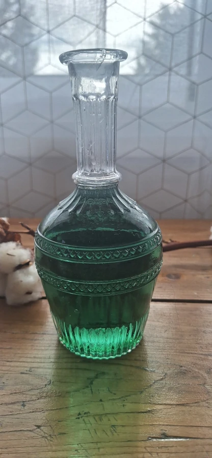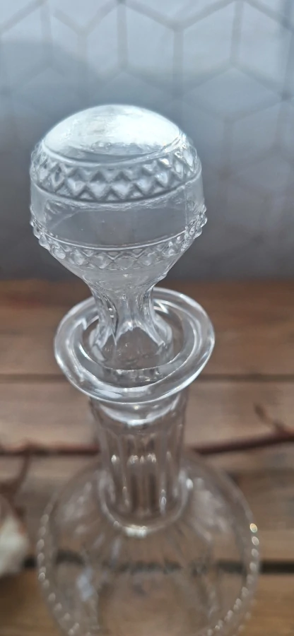 Chaque carafe a sa petite histoire. Celle-ci a patiemment conservé son bouchon d’origine, comme un trésor oublié, prête à reprendre son rôle dans une table élégante ou une vitrine curieuse. Son verre travaillé en relief raconte un geste ancien, entre utilité et décoration, et j’adore lui redonner vie pour de nouvelles aventures.
