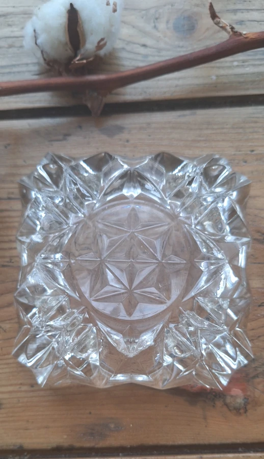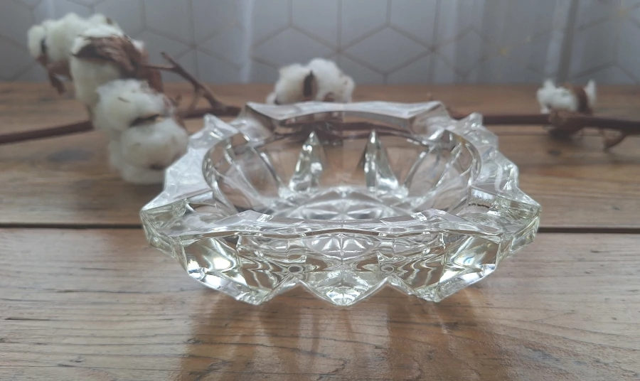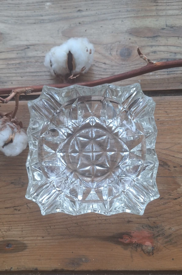 Ce cendrier en verre pressé appartient à la production française de la période Art déco tardive, entre la fin des années 1930 et les années 1940. Son décor géométrique structuré, aux lignes nettes et symétriques, est caractéristique de cette époque où l’objet utilitaire devient un véritable élément décoratif de l’intérieur.
