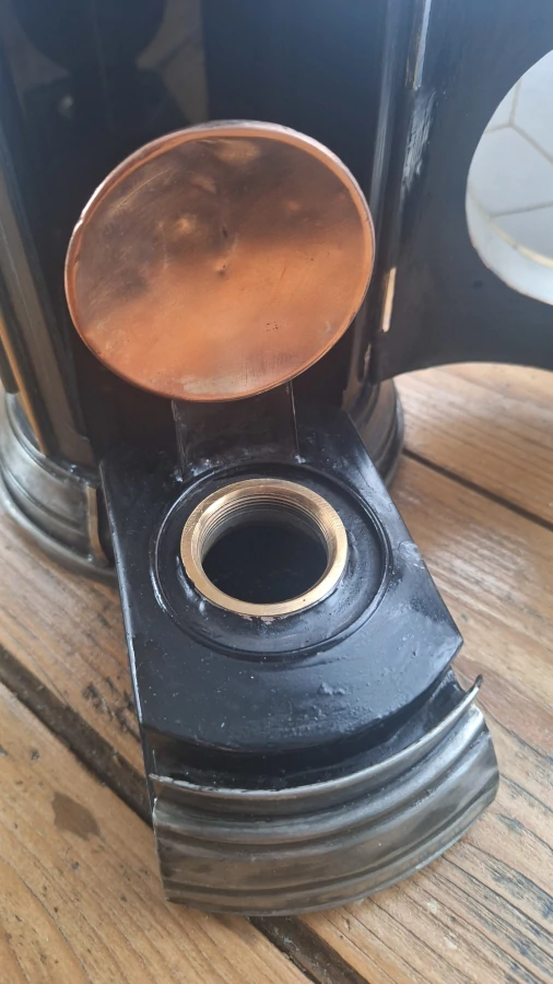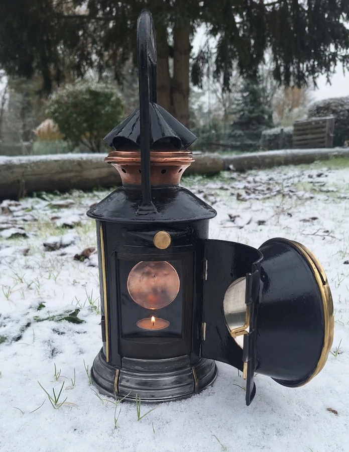 Retrouvée recouverte d’une épaisse peinture noire et électrifiée, elle a fait l’objet d’une restauration conservatrice : un décapage patient a permis de révéler le laiton, le cuivre, les inscriptions et les poinçons d’origine. Le mécanisme rotatif interne fonctionne parfaitement, une caractéristique propre aux lanternes dites “à mouvement”.