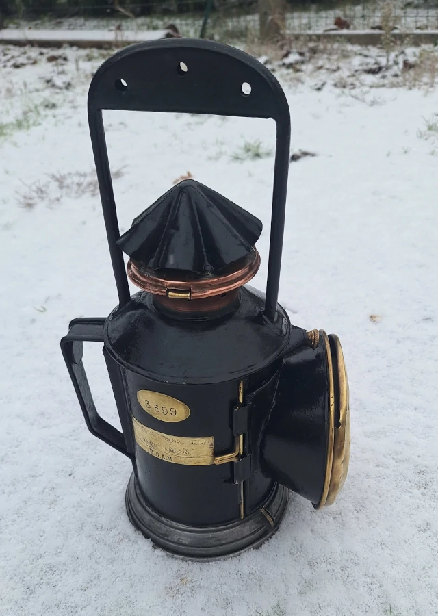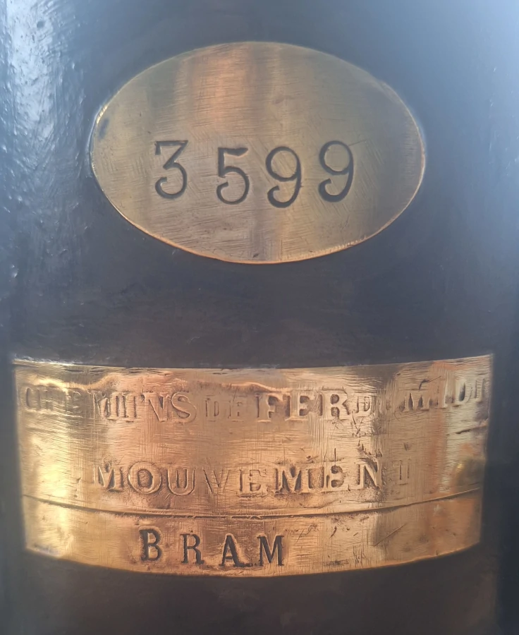Une lanterne du Chemin de fer du Midi, avec numéro d’affectation n°3599 attribué à la gare de Bram (Aude). Elle porte le poinçon du constructeur Poyard, Paris, typique des lanternes ferroviaires de la fin XIXᵉ – début XXᵉ siècle, ainsi que le poinçon « Midi » à l’intérieur de la lanterne.