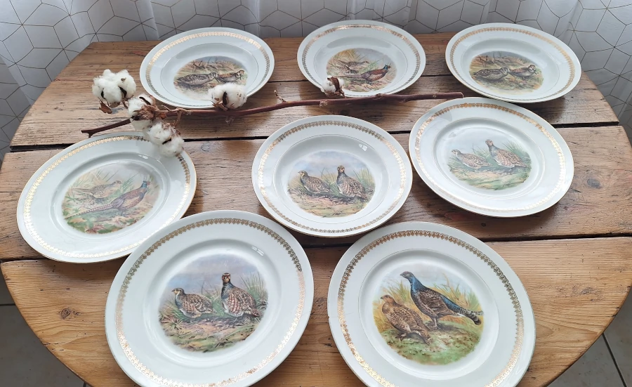 Lot de 8 assiettes – Service porcelaine véritable P.L Mehun : Gibiers.