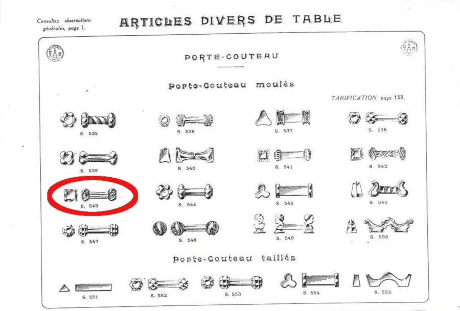 Lot de 8 porte-couteaux Baccarat – Catalogue 1916, en cristal moulé, témoignant de plus d’un siècle de savoir-faire français. Leur forme évoque de petites colonnes élégantes, avec des lignes nettes et une transparence remarquable, caractéristiques de Baccarat. Attribué au modèle S-543, typique des porte-couteaux moulés non signés de cette période, souvent équipés d’une étiquette papier aujourd’hui disparue.