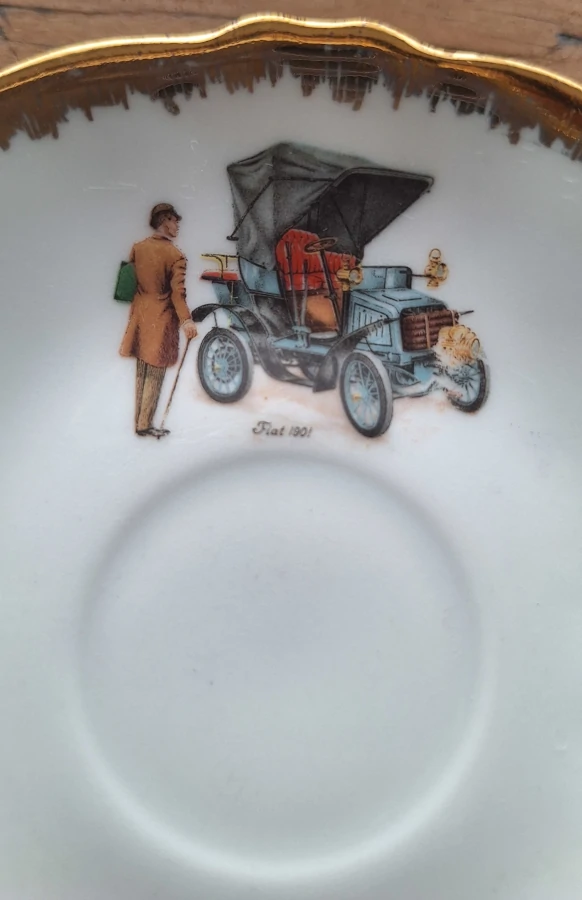 Les scènes représentées, automobiles anciennes et calèches, relèvent d’un décor narratif et historique, exécuté avec soin, caractéristique des productions berrichonnes destinées à une clientèle amateur de vaisselle décorative de qualité. L’ensemble est complété par un pourtour doré présent sur chaque pièce, l’assiette à dessert se distinguant par un travail de bordure plus élaboré, soulignant son rôle de pièce centrale au sein du lot.