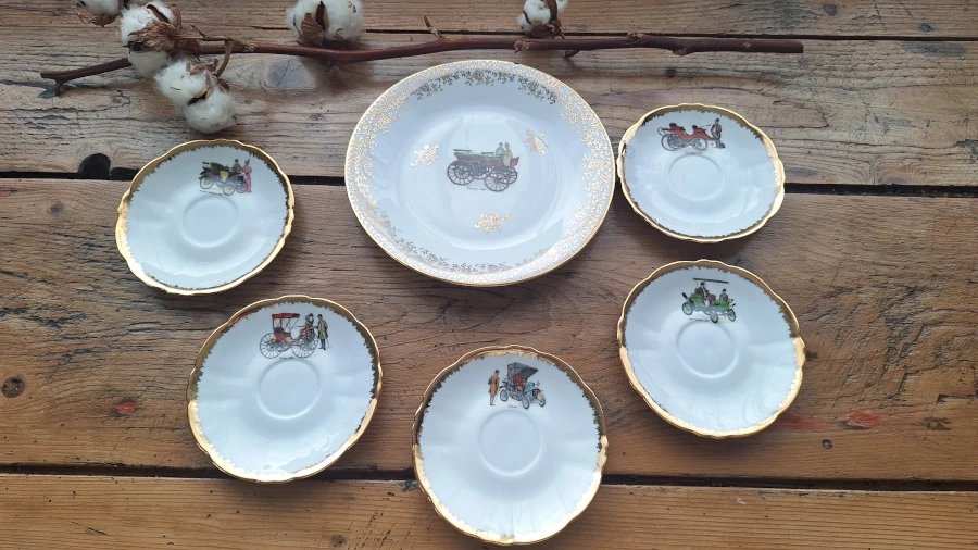 Lot composé de cinq coupelles décorées de scènes d’anciennes automobiles et d’une assiette à dessert au décor de calèche, en véritable porcelaine du Berry, produite et décorée à Mehun-sur-Yèvre (Cher).