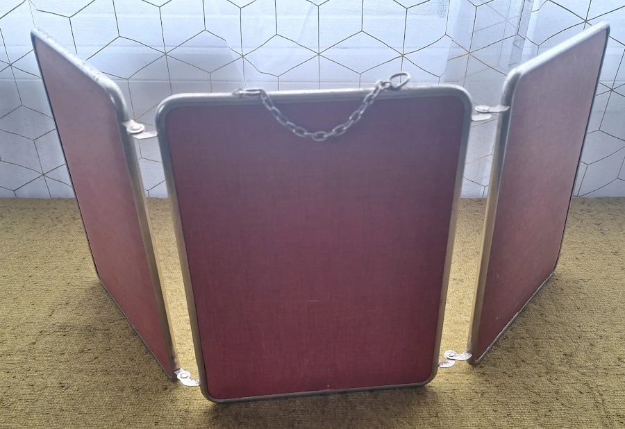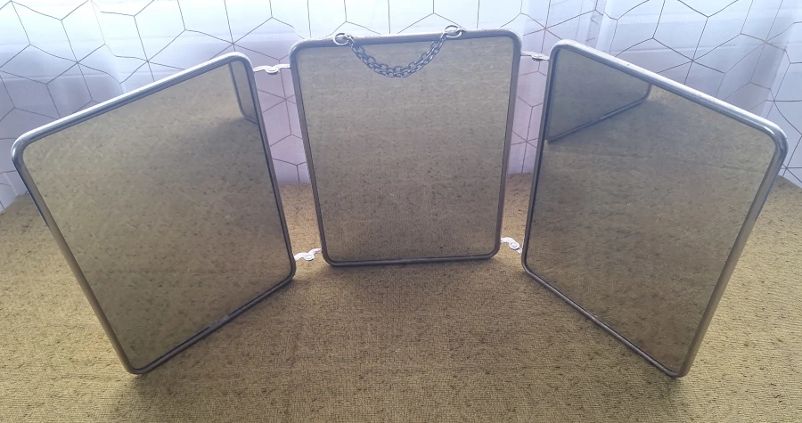 Ce miroir triptyque Art Déco 1925-1935 est un accessoire ancien de coiffeuse, solide, pliable et pensé pour un usage quotidien. Il permettait d’obtenir une vue complète du visage et de la coiffure grâce à ses trois panneaux orientables.