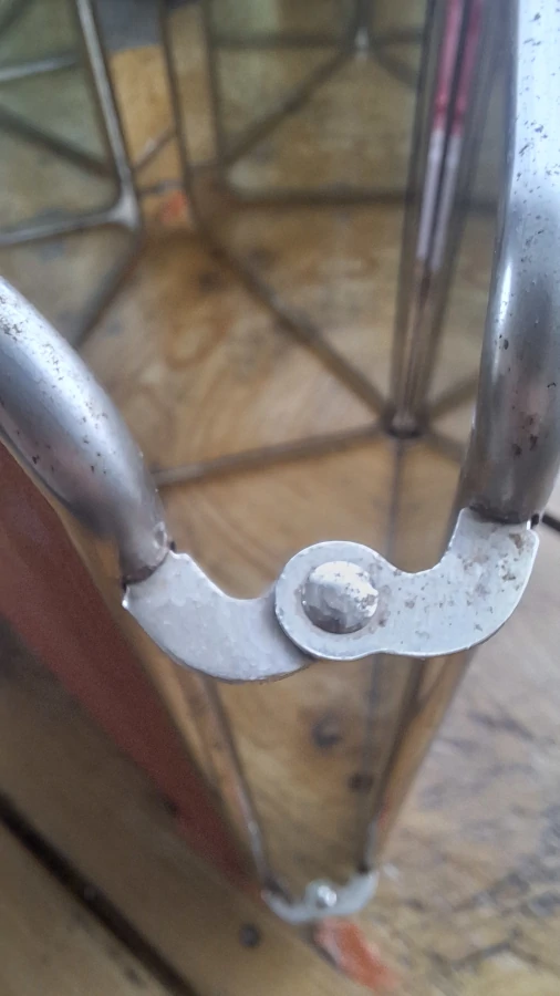 État : Très bon état vintage, miroirs piqués légèrement, cerclage intact, patine naturelle du métal