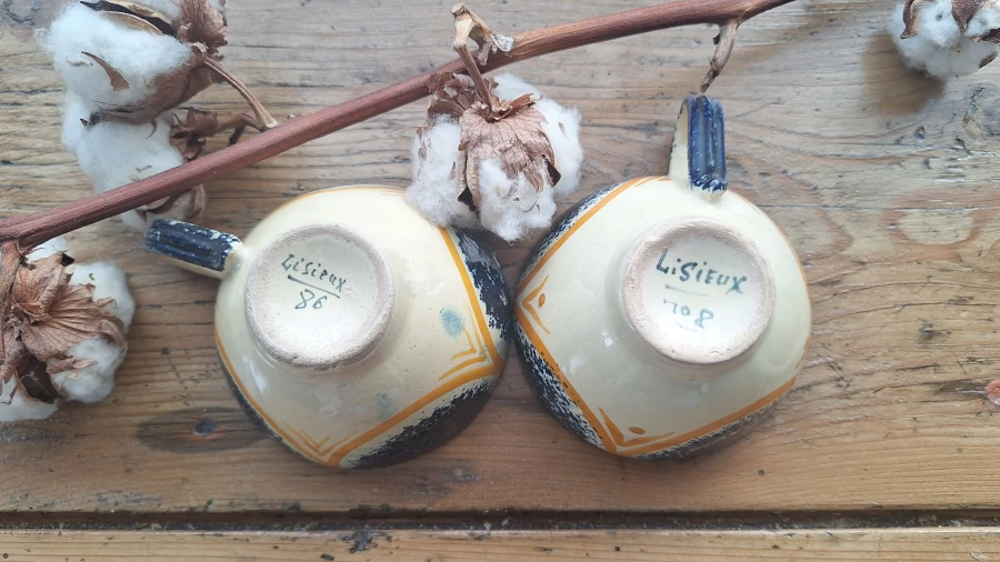 Le grès, épais et lourd, témoigne d’un travail d’atelier : formes légèrement irrégulières, anses façonnées à la main, émaillage vivant. Le marquage “Lisieux” au revers indique une production locale, probablement destinée à l’usage quotidien ou au souvenir régional, typique de la Normandie de cette période.