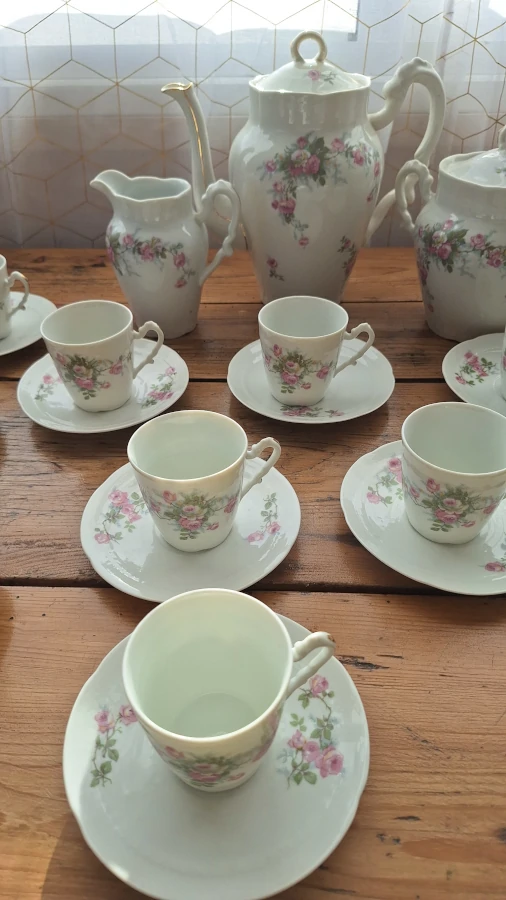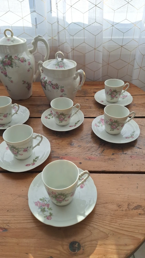 - Dimensions : Coupelles : Diamètre 13 cm. Pot à sucre : H 17.5 cm, L 17.5 cm, diamètre : 10 cm. Pot à lait : H 13 cm, L 13 cm, diamètre : 6 cm. Tasse : H 6,5 cm, L 8 cm, diamètre : 6,5 cm. Théiere : H 23 cm, L 23 cm, diamètre : 9,5 cm.